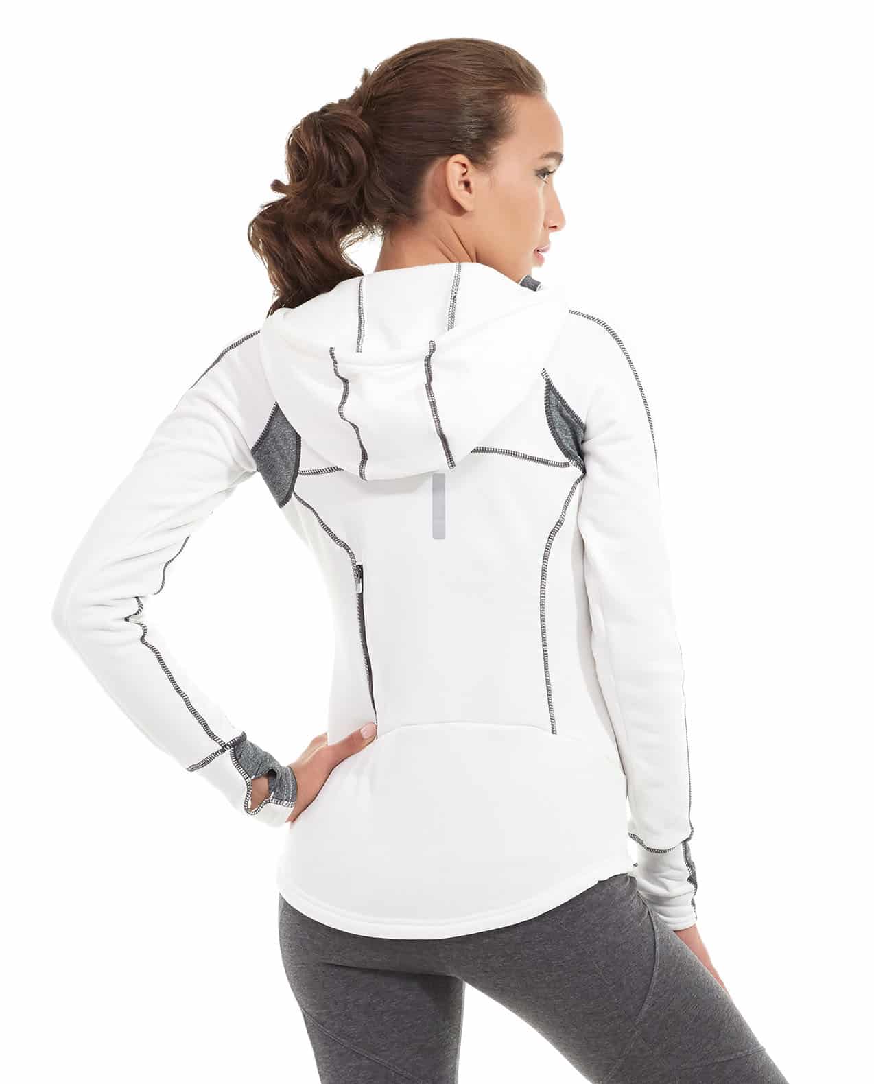 • White full zip hoodie with gray detail.